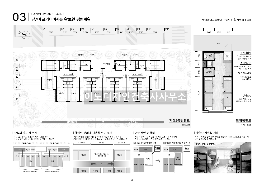경상남도 밀양시 교육지원청에서 추진한 밀양동명고등학교 기숙사 건립사업 설계 공모당선작 입니다. 본 설계안은 층별 남·여 공간을 명확히 분리하고 설계기준에 부합하는 평면계획을 제시하였으며, 층고를 활용한 입면디자인과 가변성 대응 측면에서 우수한 평가를 받았습니다.
